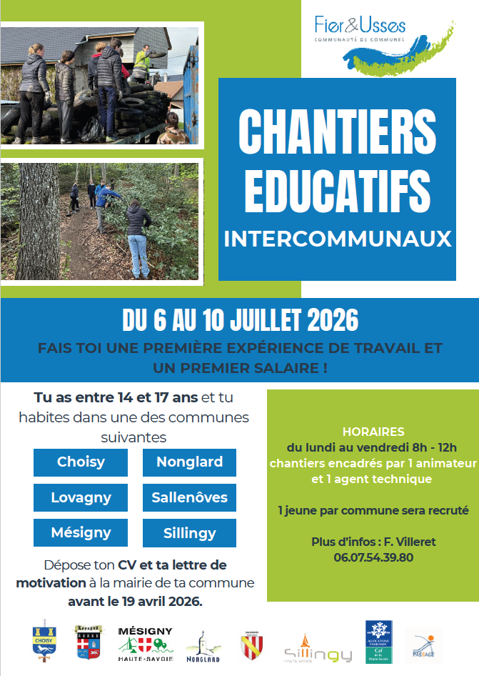Les six communes de la CCFU (Sillingy, Sallenôves, Mésigny, Nonglard, Choisy et Lovagny) proposent aux jeunes entre 14 et 17 ans de participer aux chantiers éducatifs du 6 au 10 juillet 2026.