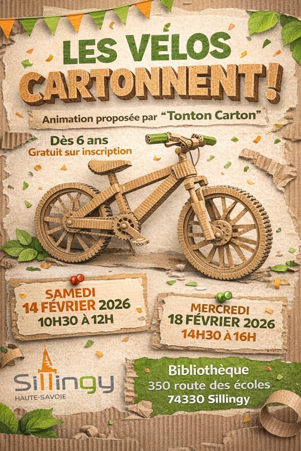 La bibliothèque vous propose de venir participer à un atelier créatif : laissez libre cours à votre créativité en fabriquant votre propre vélo en carton proposé par Tonton Carton. Fabriquez et personnalisez vos modèles tout en apprenant l'importance du recyclage et de la réutilisation des matériaux.
