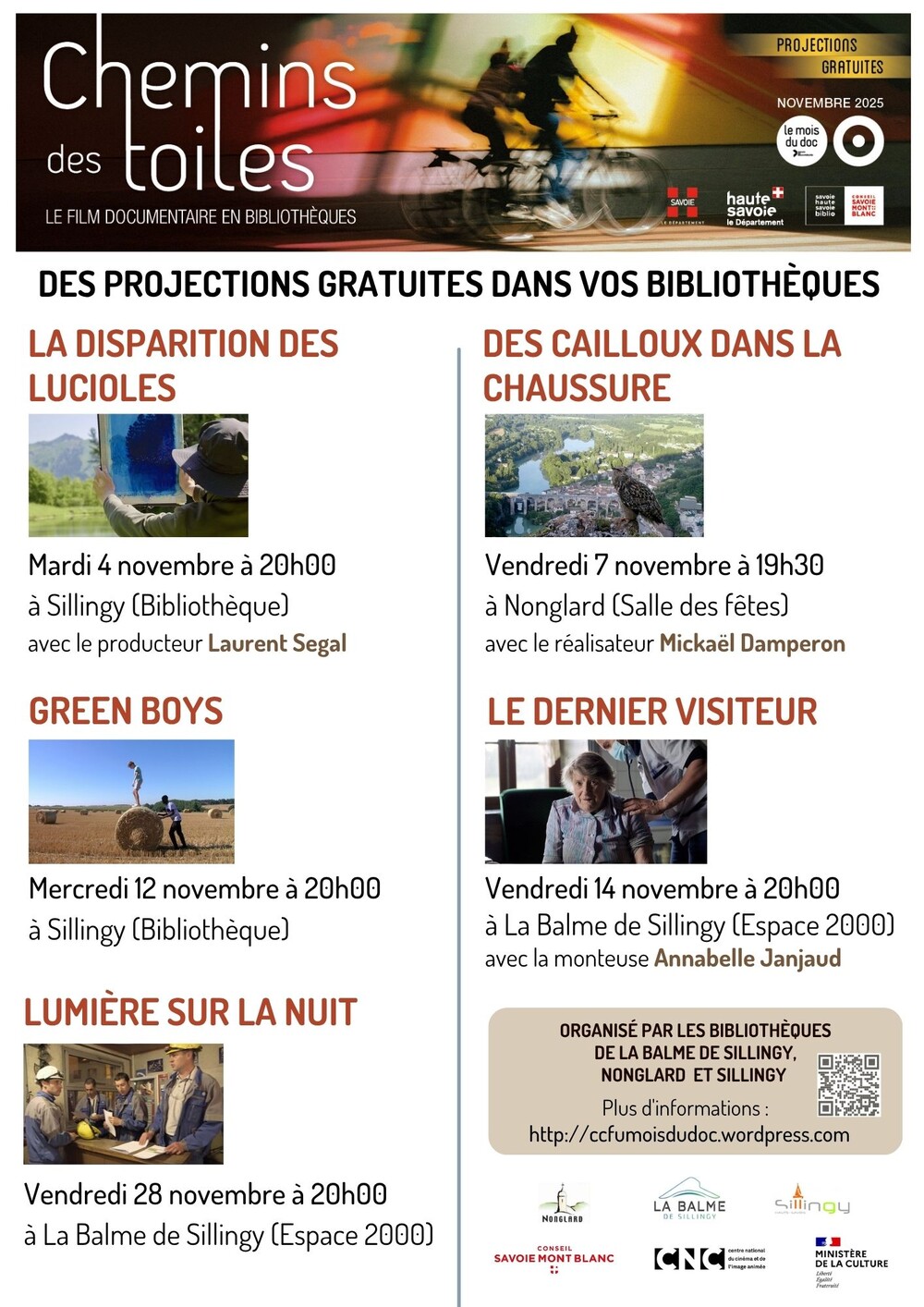 A l'occasion de la manifestation Chemins des Toiles, en partenariat avec Savoie et Haute-Savoie Biblio, les bibliothèques de La Balme de Sillingy, Nonglard et Sillingy vous proposent des projections gratuites de films documentaires, tout au long du mois de novembre. Retrouvez l'intégralité de la programmation sur le site : http://ccfumoisdudoc.wordpress.com