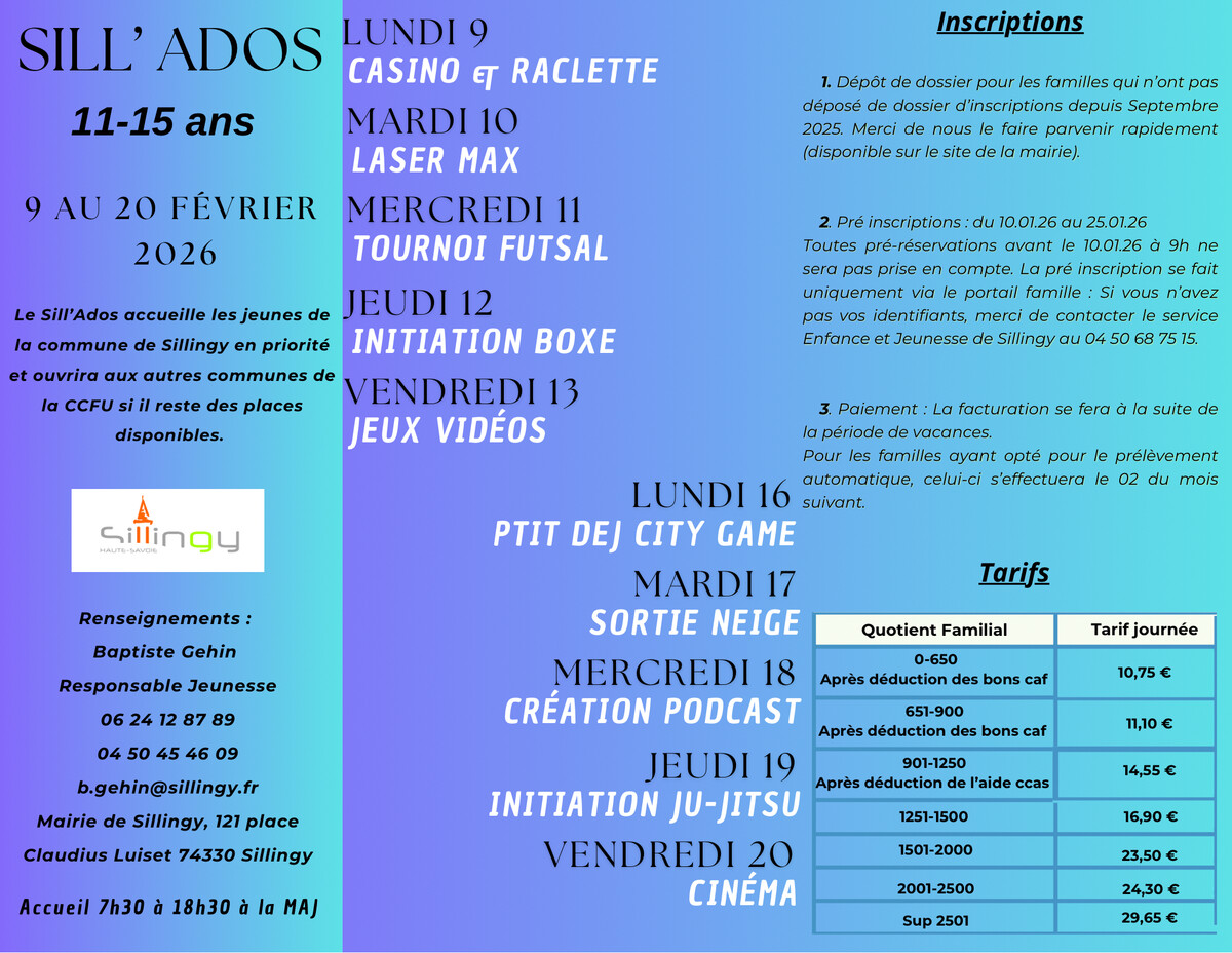 Le directeur de l'accueil de loisirs Sill'ados est Baptiste GEHIN (06 24 12 87 89).
